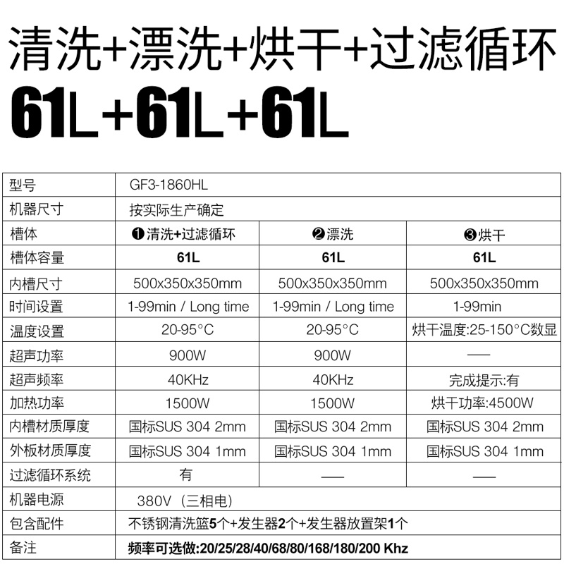 - 三槽工藝:超聲波清洗+過濾>漂洗>烘干其它等工藝可定制;
